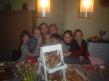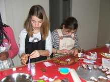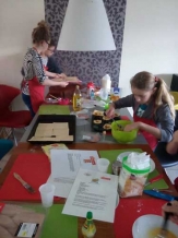 6 meiden van 10 en 11 jaar gingen aan de slag met chocolade. De jarige Jet wou graag een figuur, dus zij mocht aan de slag met een mal vol allerlei 'echte-meisjes-dingen; lippenstift, pump, stoere zonnebril,enz. Daarnaast werden er sneeuwballen, speculaas truffels en een marsepein bonbon met sinasappel gemaakt. En een heuse chocolade taart! Het kinderfe...